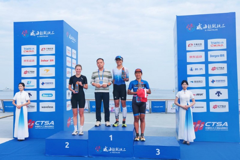 (环翠楼1736红参董事长林旭光为威海超级铁三女子组前三名颁奖)